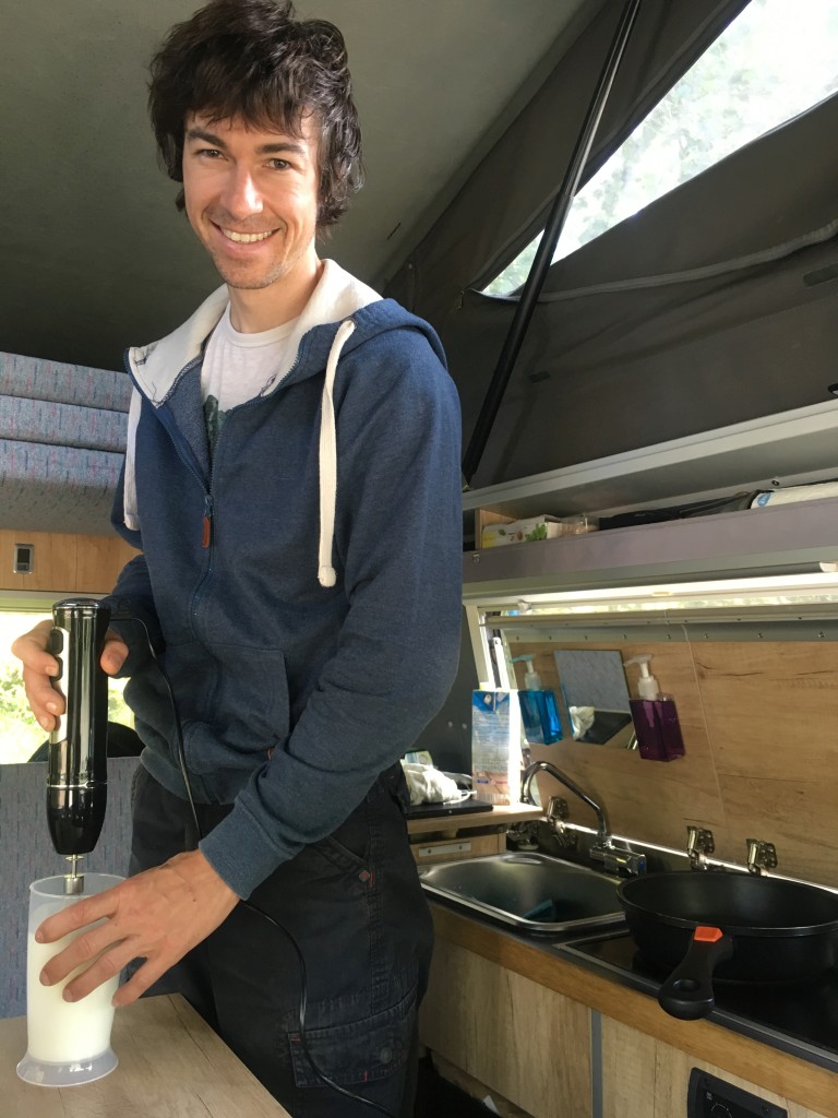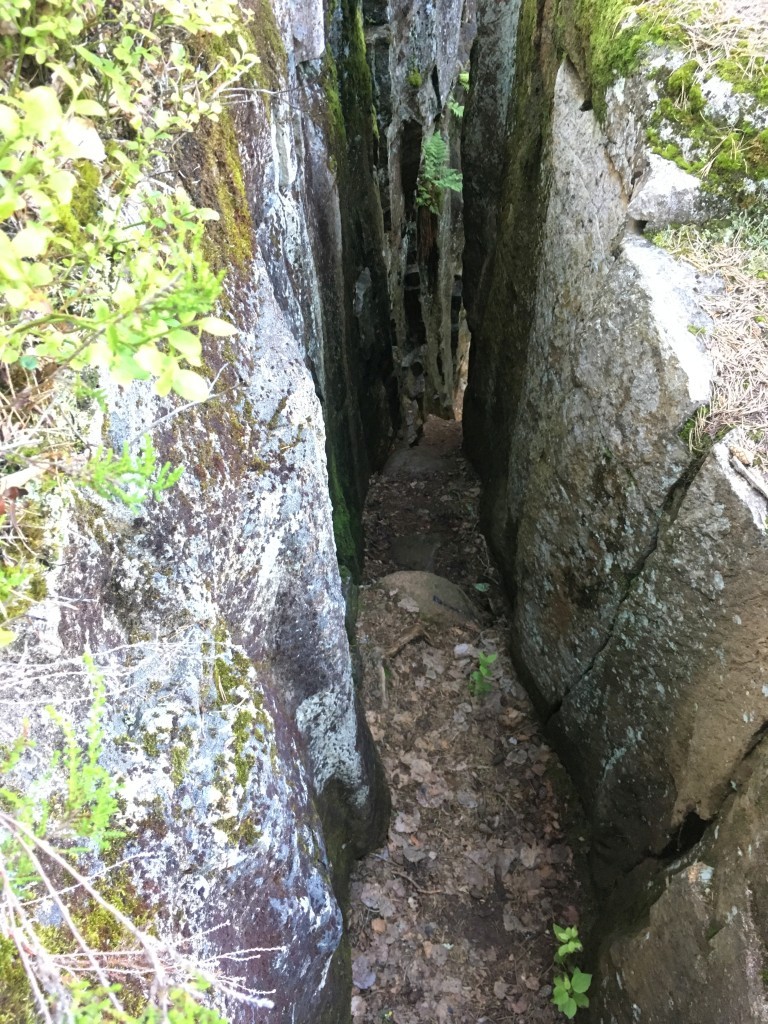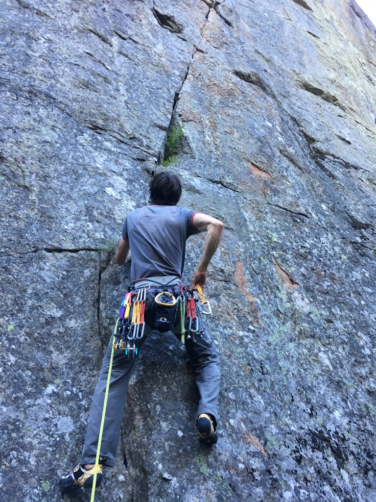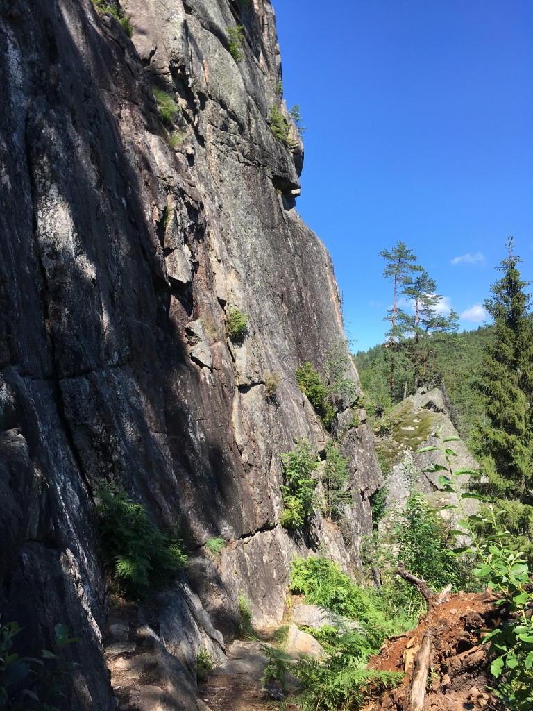 We start our first real day of our vacation with a leisurely breakfast. Sigi makes pancakes (lactose free of course) and I start my travel diary in the meantime. It has been drizzling at night and therefore we do not set off for the climbing area until early afternoon. Since this is a local recreation area of Oslo, the main paths are wide and well maintained. Only the last few hundred meters we have to walk on small forest trails surrounded by blueberries. The foremost sectors are easy to access. The descent to the backmost sectors is a little bit more difficult because both options are steep and slippery. The best way is through a narrow crevasse in the ground. We climb in the backmost sectors since they seem to be varied and provide a good mixture of grades. In our opinion the grading is rather hard. Furthermore, some of the topos in the climbing guidebook Climb Norway are quite confusing. On the first day Sigi climbs a route, which is supposed to be bolted, but after an overhang it turns into a trad route without any protection. The next day he tries a 6a trad route. However, the moves are far too hard for this grade. Therefore, we ask a Norwegian couple if we can have a look at their local climbing guide. It turns out that the first pitch of this trad route is 7b and the second one is 6a. In addition, we find out that the grades of some routes do not match. In the climbing guidebook Climb Norway the Norwegian grades have been converted to the French grades, but apparently not consistently and with a special conversion table. Most of the routes between 6a and 6c are affected.