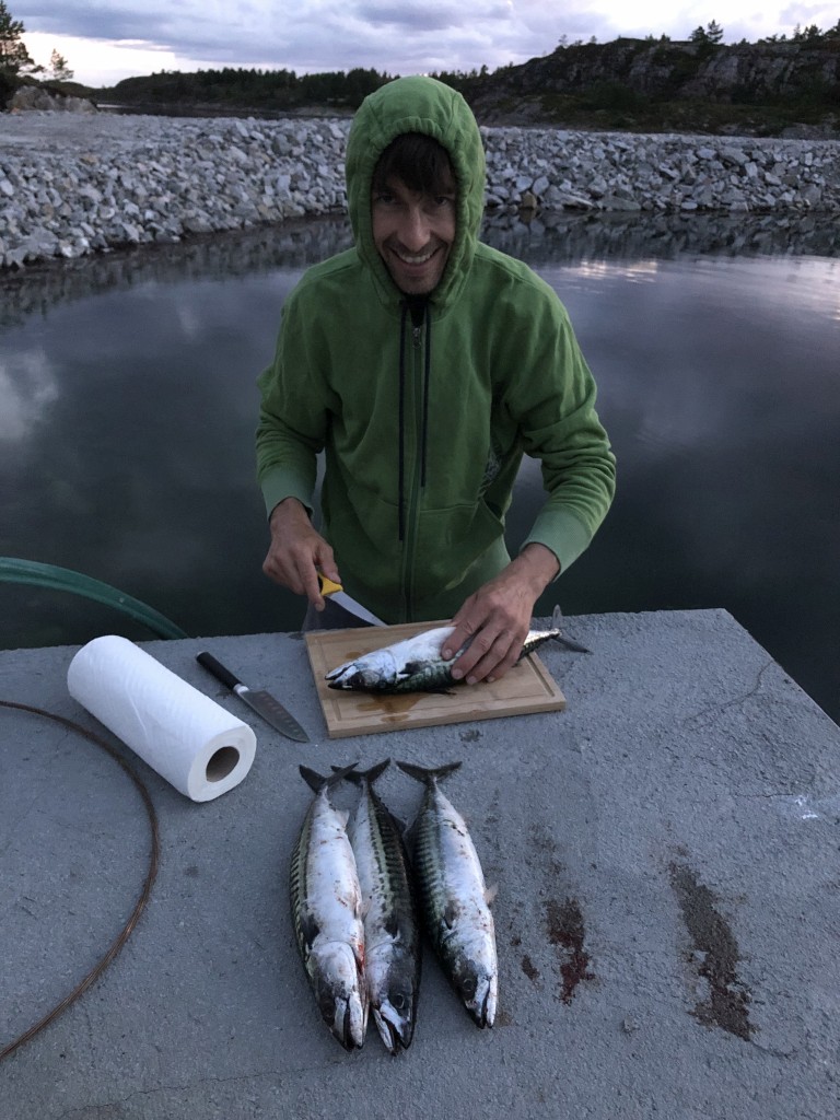 Since we see movements in the water during breakfast, we cast our fishing rod again. We immediately catch a mackerel. By changing the flasher we are able to catch nice pollacks too which we turn into fillets.
