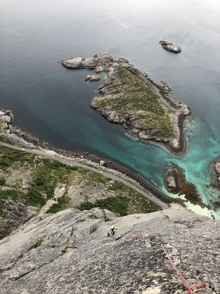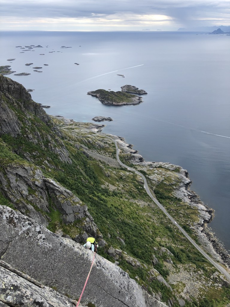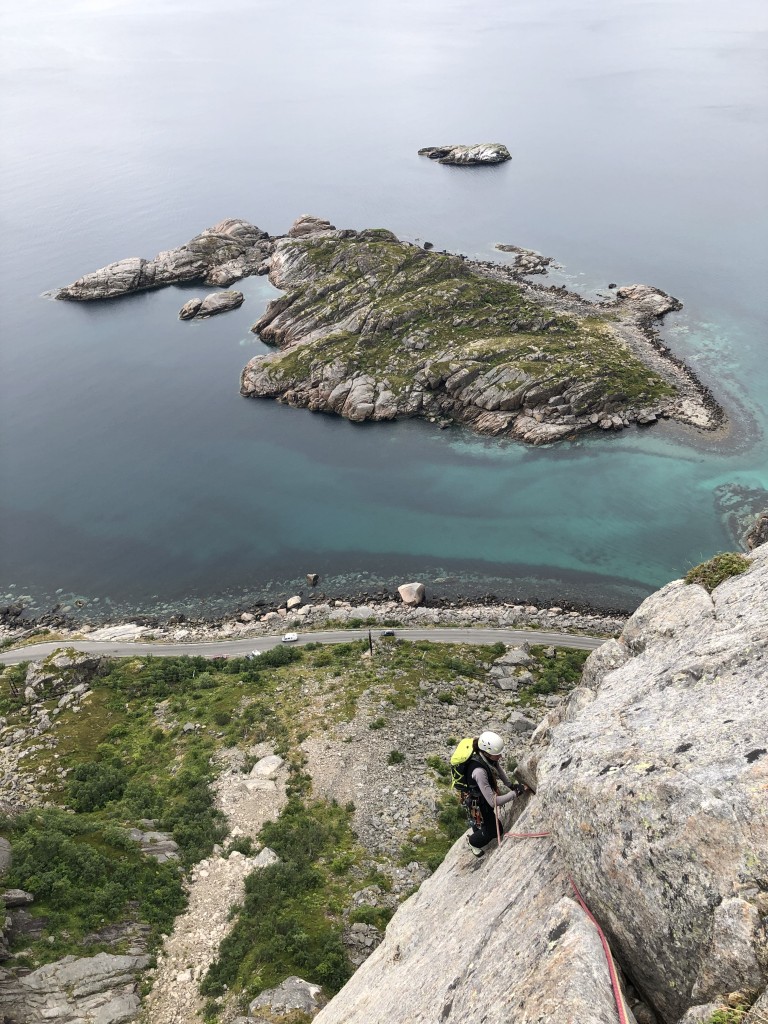 It is stated that the Himmelen kan vente is exhausting and N6+ is close to my limit. With a queasy feeling I start climbing. The second pitch is already a N6+ with an offwidth crack which Sigi cannot protect because he lacks the proper gear. Sigi climbs very precisely and concentrated because he knows that falling is not an option. I simply start climbing. Step by step, hold by hold. I make good progress and especially the crack climbing gloves are paying off now. As we get higher and higher, my confidence increases and I can really enjoy the climb. Unfortunately, we catch up with the Finns on the last pitches and have to take another longer break. It is not even 17:00, however, the rain sets in. At first it is a light drizzle but it gets stronger and stronger.