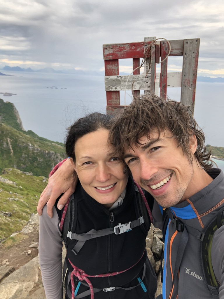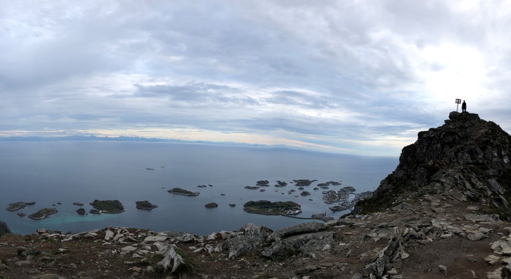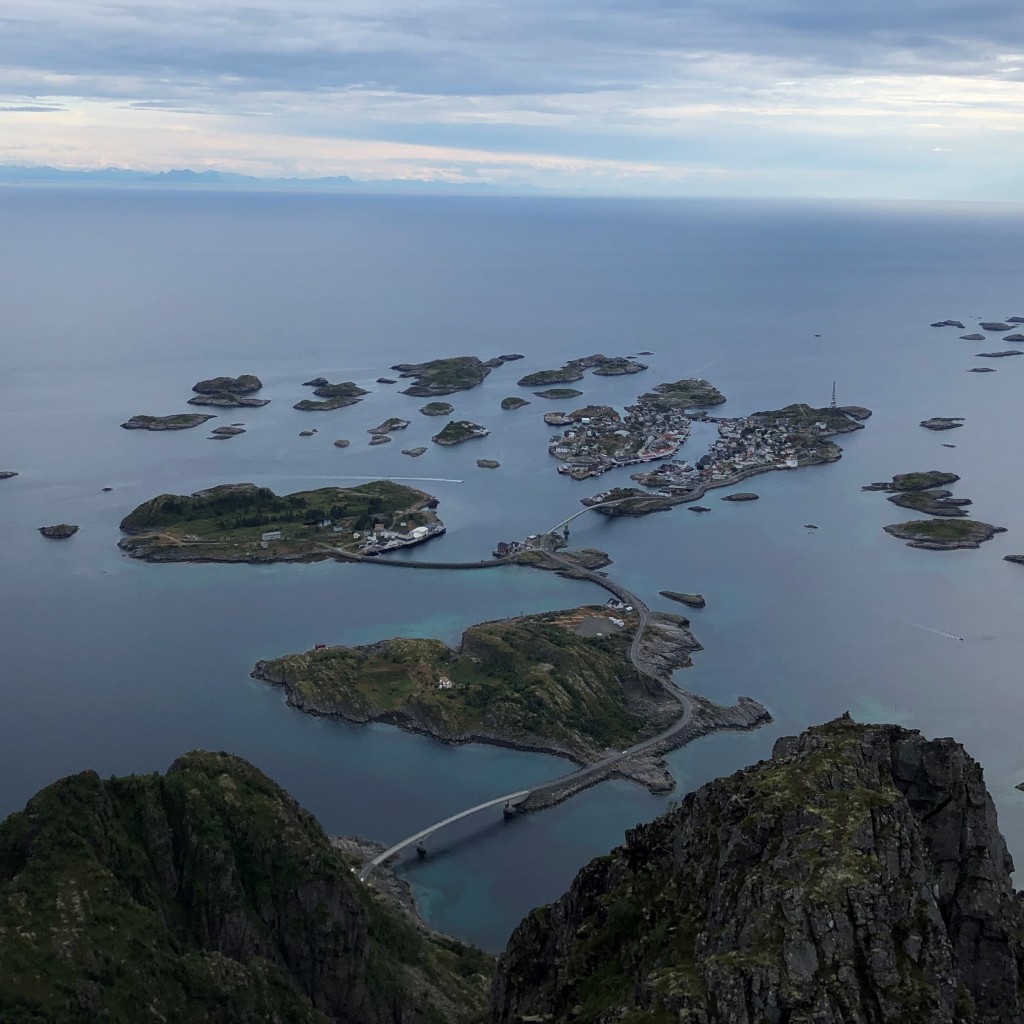 Since it has stopped raining, we take a small detour to the top of the Festvågtinden (541 m) on our descent. The view from this peak over the surrounding area and Henningsvær is stunning. It is very popular among tourists because there is a hiking trail leading up to the summit. We pass a few young men wearing sneakers and holding a beer can on their way down. One of them is even having a video chat with his girlfriend as he walks down the steep and slippery path. It is a miracle that accidents do not happen more often.