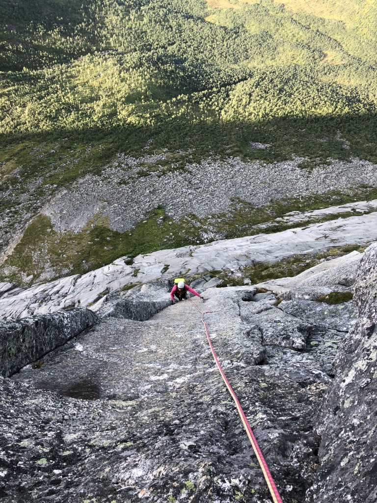 Some sections of the first pitch are still wet and slippery. Therefore, we have to climb very carefully. The wind has dried up the remaining pitches of Vestveggen quite well. But it is still blowing strong and carries cold air from the snowfields to us. Since we are climbing in the shade, we are quite cold when belaying and waiting for each other. Due to his icy fingers, Sigi drops his nut set. Karen immediately gathers all nuts she has twice and hands them over to me. Just before the hardest pitch I take a picture of Sigi and I put the mobile phone back into my pocket. Unfortunately, I do not close it completely and the next strong wind gust blows it out. A stupid beginner’s mistake. I have to watch how the wind carries away the mobile phone and all of my photos taken on the Lofoten. This is what you get when you only backup every few days.
