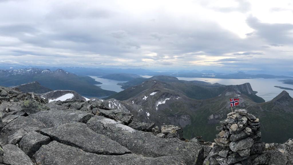 The Vesteggen begins with crux, a wide and persistent crack. Sigi climbs most of the pitch without protection because he lacks the necessary gear (large camming devices). Since he has little experience with cracks and the crack is still wet, this section is mentally quite challenging for him. The crack has an unpleasant width: While Marius does a fist jam, I have to slide in my whole arm. For us the lower graded pitches are harder. Maybe because the rock is quite wet and slippery. In addition, I am now climbing with four taped fingers because the skin was worn through and they started bleeding. The N6 pitch in the upper section is particularly challenging because our topo points us in the wrong direction. Fortunately, Karen and Marius are with us. They have a description from another climbing guidebook which includes more details. Nevertheless, this pitch is mentally intense: The rock is slippery, Sigi cannot place proper protection at the crux and due to the tape I have no friction on slopers. We are happy and relieved when we reach the summit. A strong wind is blowing, but the view is amazing. After a while Karen and Marius join us and we celebrate the successful ascent.