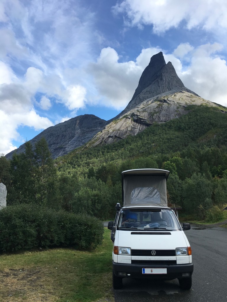 Much to our delight, Karen and Marius do not think twice. The four of us set off for the Stetind. Karen and Marius drive ahead since they have already climbed the Sydpilaren on the Stetind and know how to get there fastest. On the way it starts to rain. When we arrive at the parking area near the Stetind late in the evening it is pouring. Everyone feels a bit queasy whether it will stop raining in the night and dry up properly. We decide to march off at 5 o’clock at the latest and to make the final decision at the starting point of the route. At midnight it stops raining and a strong wind sets in. The Stetind emerges from the fog.