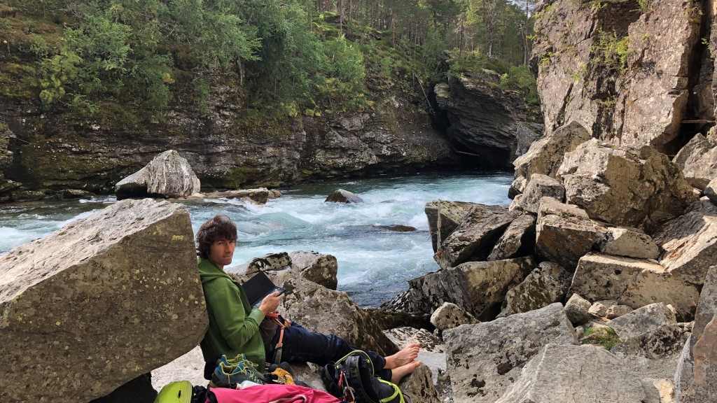 The sector Øvre is located in the middle of the forest, but the conditions for climbing are perfect. Therefore, we are not alone. We get to know three Norwegian climbers who immediately recommend routes and reveal a good spot which is not listed in our climbing guide.