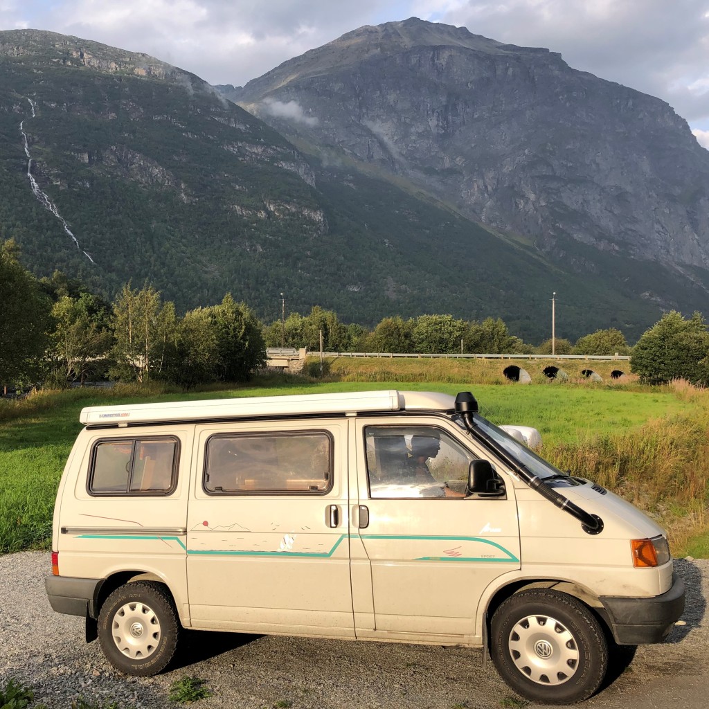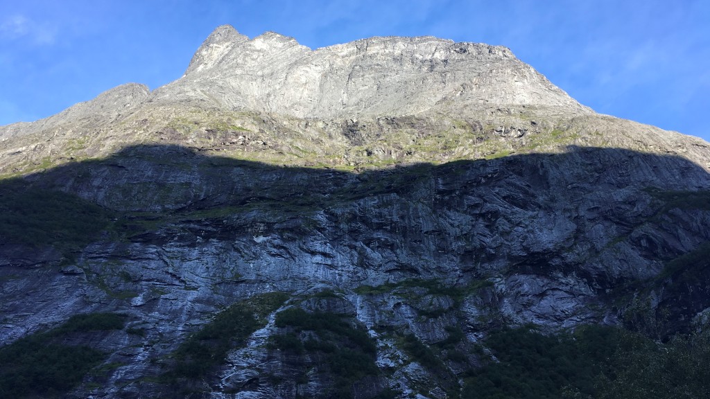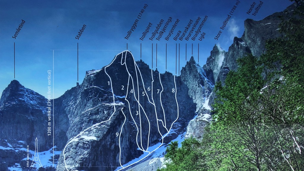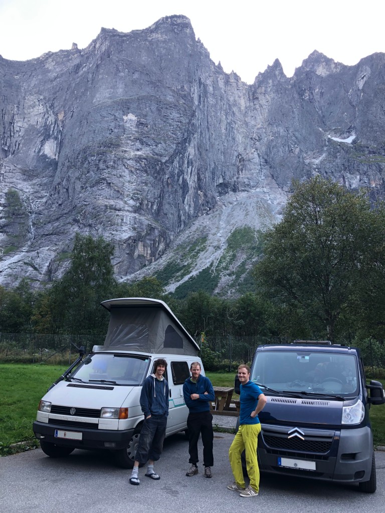 26.08.2019 - The Trollveggen is the highest steep face in Europe. The rock face rises up to 1700 meters above the valley. The vertical part of the wall is up to 1000 meters high and juts out up to 50 meters. Impressive. Despite the current base jump restrictions, we watch two base jumpers landing nearby. Several base jumpers as well as climbers have lost their lives at this place. Interestingly, many Czech climbers are among them. Due to the high risk of falling rocks, this wall is nowadays mostly climbed in winter or spring when the rock is still frozen. It is definitely a rewarding destination.
