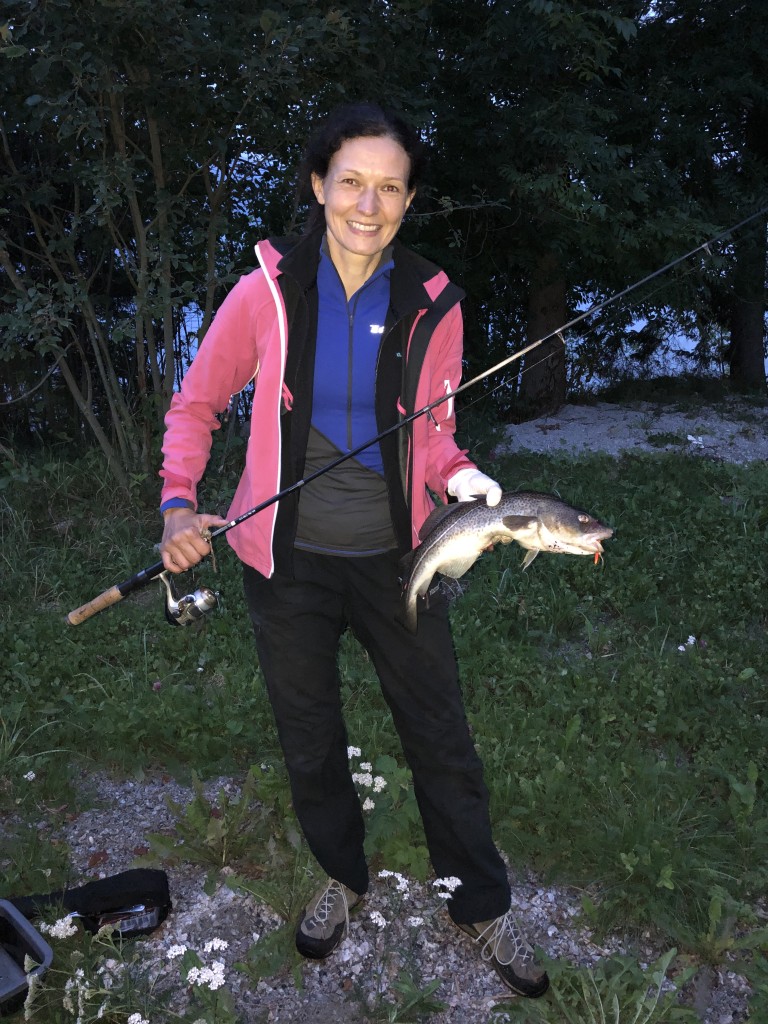 We spend the night near a small salmon breeding station (SalMar) right next to the sea. While Sigi is cooking, I head to the pier for fishing. I catch a nice cod for the next dinner.
