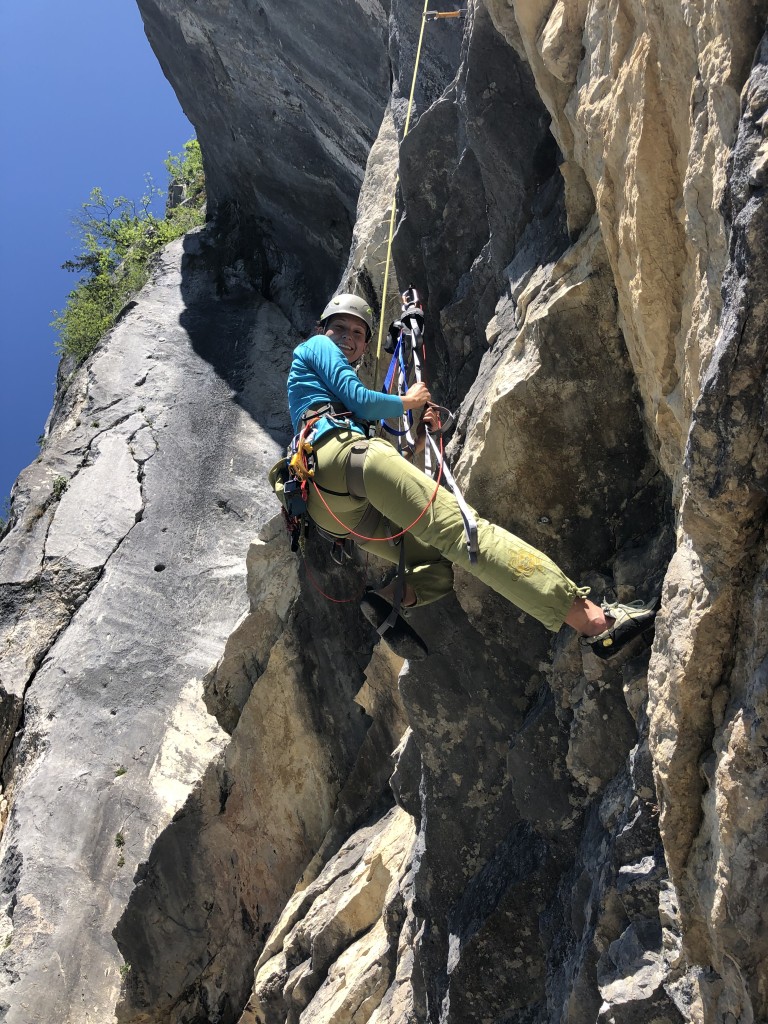 By the time it is my turn, I almost burn up. Quite quickly I leave the first bolts behind me. After that the route gets really exhausting. It is overhanging and it takes a lot of effort to climb up the aiders, and to unhook and reposition them. More than once the daisy chain allows me to gain a few extra centimeters and to rest. The moves between the last four bolts are definitely the most difficult ones. They are wide and diagonally upwards. I guess this is the section the apprentice has to pass his exams. I am proud of Sigi for leading it quite easily. Since I cannot reach the quickdraws, I get some help by extending them.