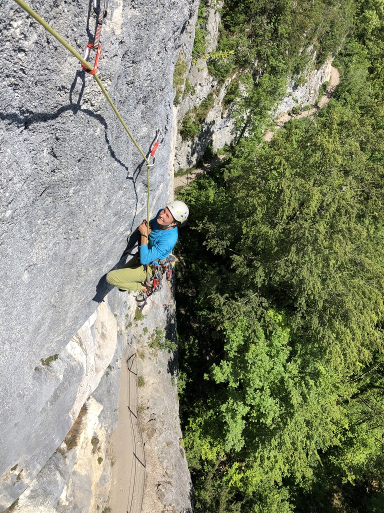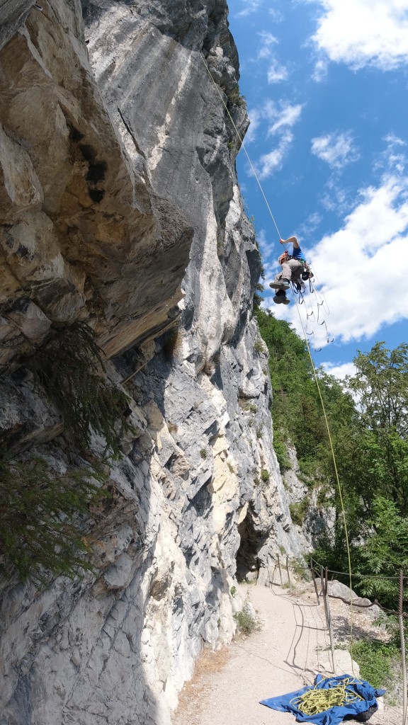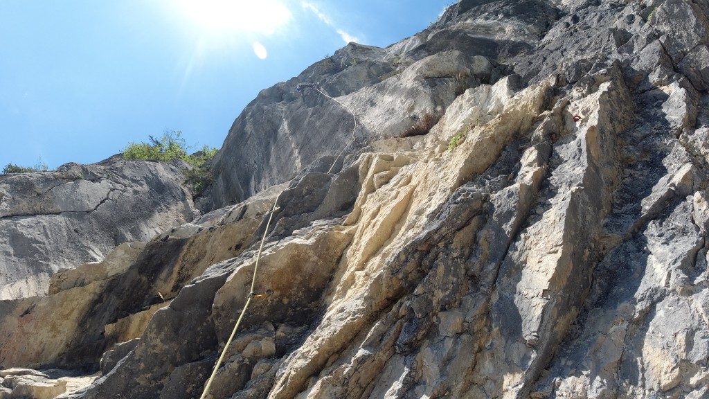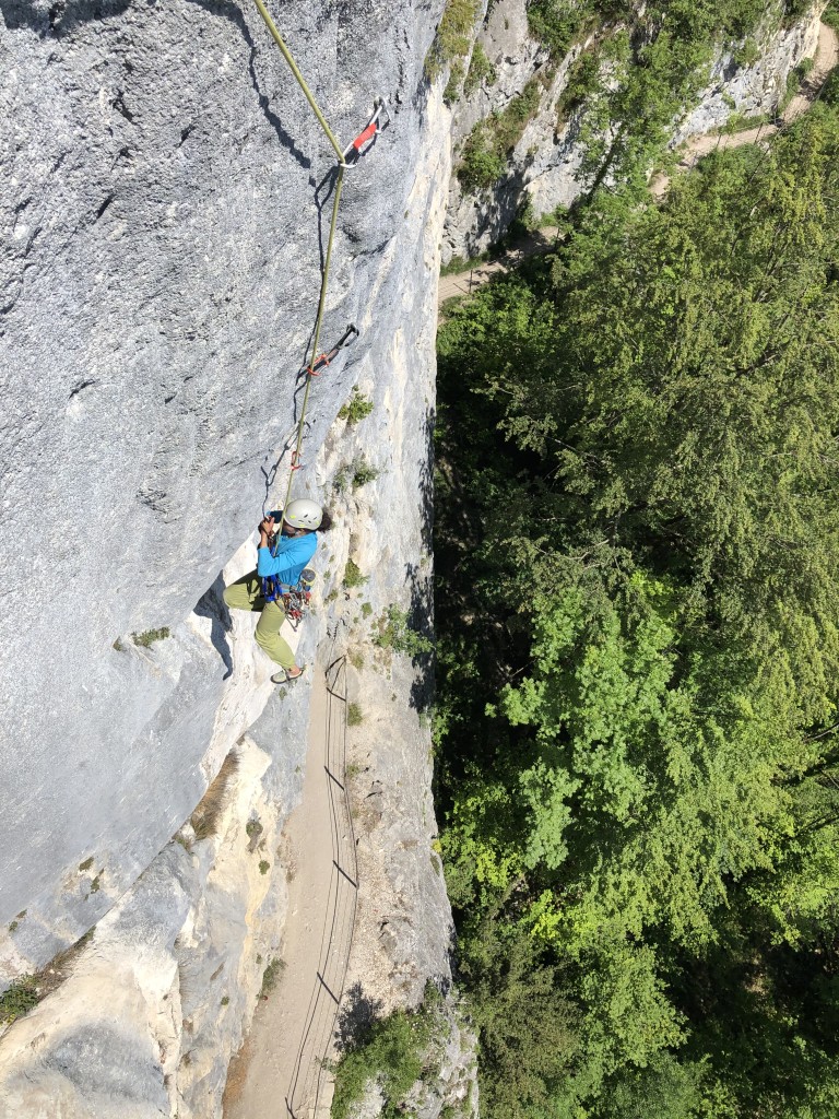 The sun is burning down on us. It would be definitely too hot for sport climbing today. But we are not here to cling to the rocks, but for aid climbing. Sigi sets off to lead the route Techno-Lehrling. He is quite fast although the route is constantly overhanging. For the last three moves he also makes use of his variable daisy chain. At this point I already notice that he has to make an effort on these moves including a wide straddle, but that does not mean anything yet.