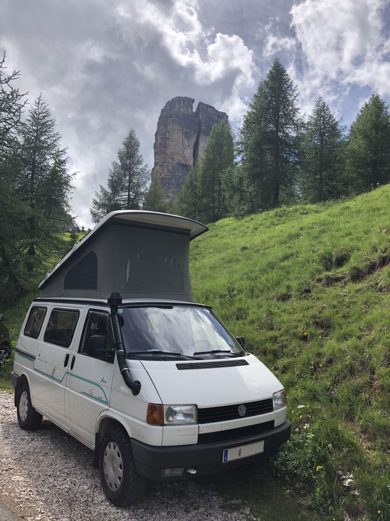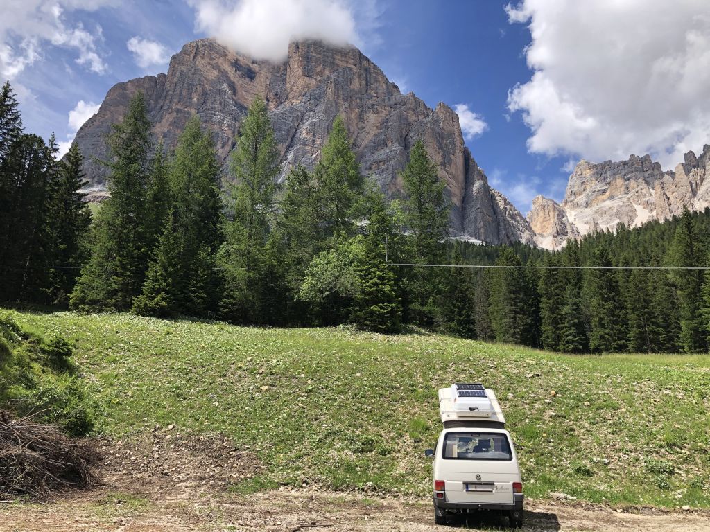During the planning for the next days we discover that the road leading to the Cinque Torri is open. At the end of this small road there are parking spaces, some of which are suitable for overnight parking. The approach is thereby shortened from more than 1.5 hours to 15 minutes. Furthermore, the view is fantastic and dinner can be enjoyed even more.