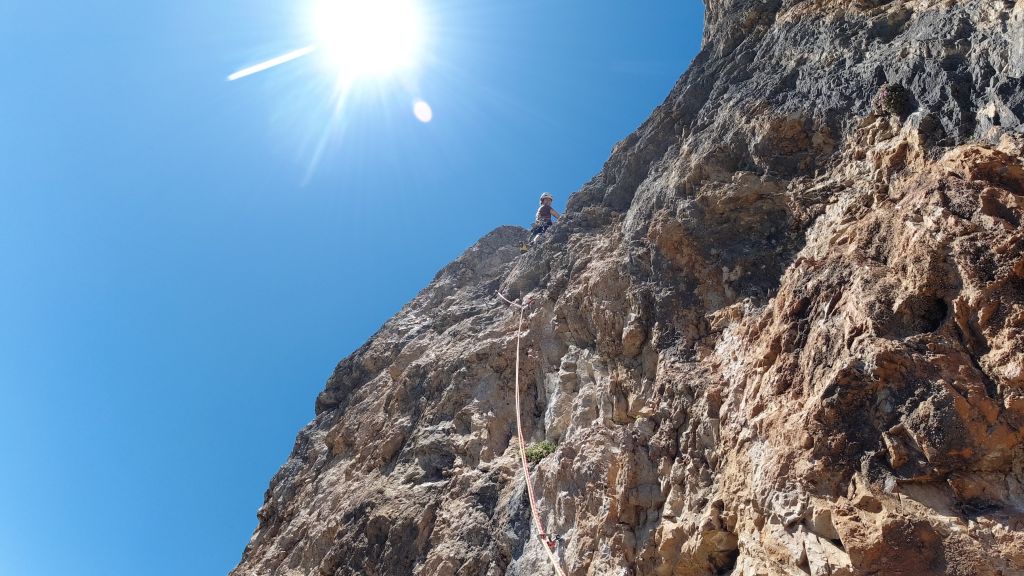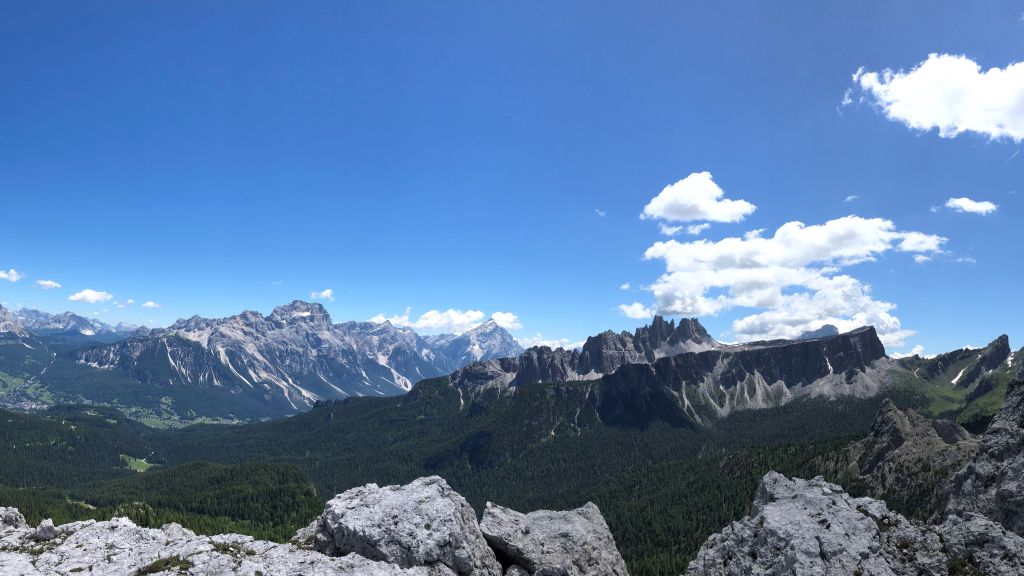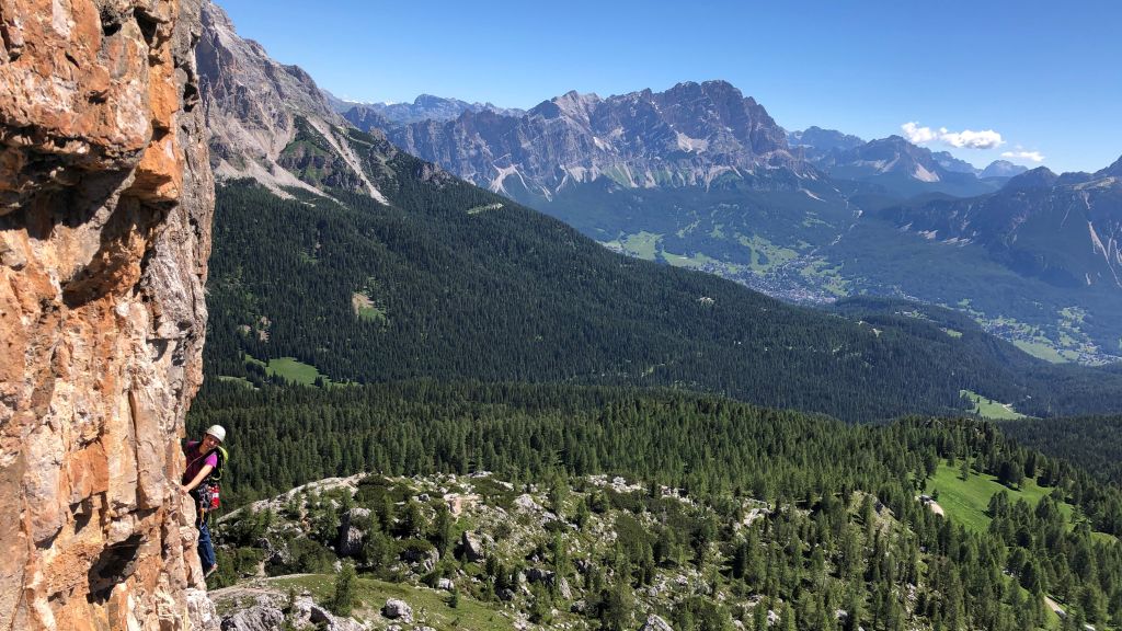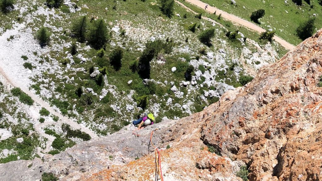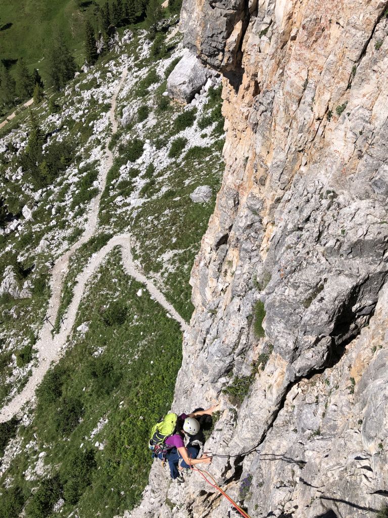 05.07.2020 - The peaks of the Cinque Torri can be reached via many different routes of varying climbing difficulty and length. To get used to climbing in the Dolomites we choose the route Diretta Dimai (VI+, 7 pitches) on the Torre Grande Cima Sud. It takes us 15 minutes to get there from our parking space. A rope team of three is already climbing the first pitch. Since we would like to overtake them, we do not wait too long. For me the first pitch is a quite poor way for getting used to Dolomite climbing because it is quite slick. Even though the climbing difficulty is limited to the fifth grade, it definitely feels harder. After that the route gets more and more beautiful with every pitch. At the traverse the other rope team takes the wrong direction and follows a shorter and easier route. Therefore, we have a clear run or climb. The fifth pitch is really beautiful. The following 6+ pitch has a short hard crux which is definitely climbable. In general the protection is very good. The only exception is the first pitch.