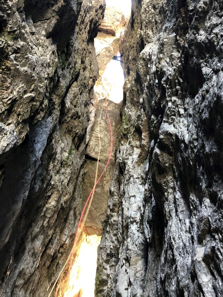 After seven pitches we are just below the south summit. Via the normal route we reach the summit plateau of Torre Grande Cima Sud. The view on the surrounding Dolomite peaks and the green valleys is simply magnificent. We let our eyes wander and enjoy the moment. After a short nice chat with the rope team of three, which we meet again on the summit, we rappel three times in the gap between the Cima Sud and Cima Nord. All in all it is a nice climb at pleasant temperatures.