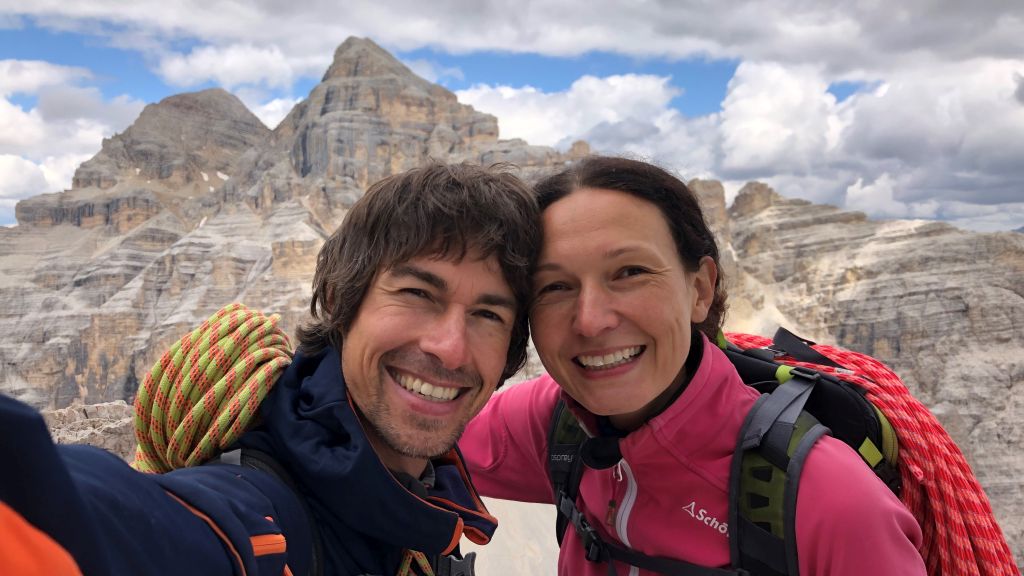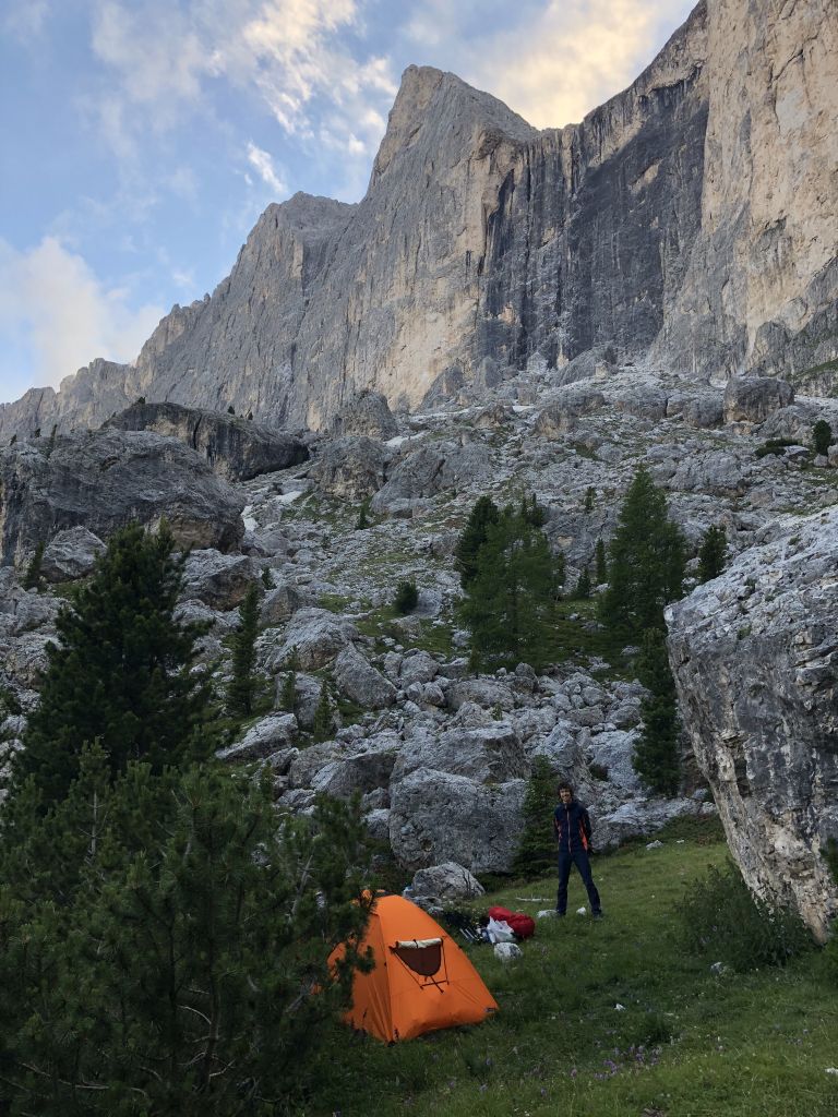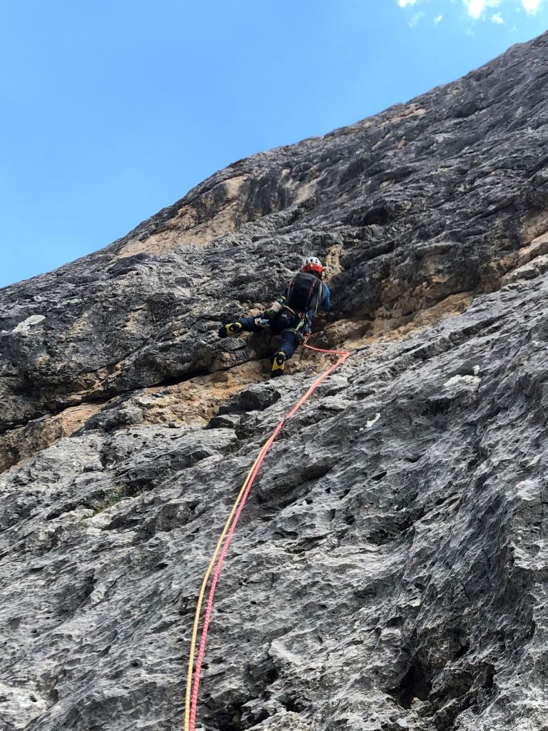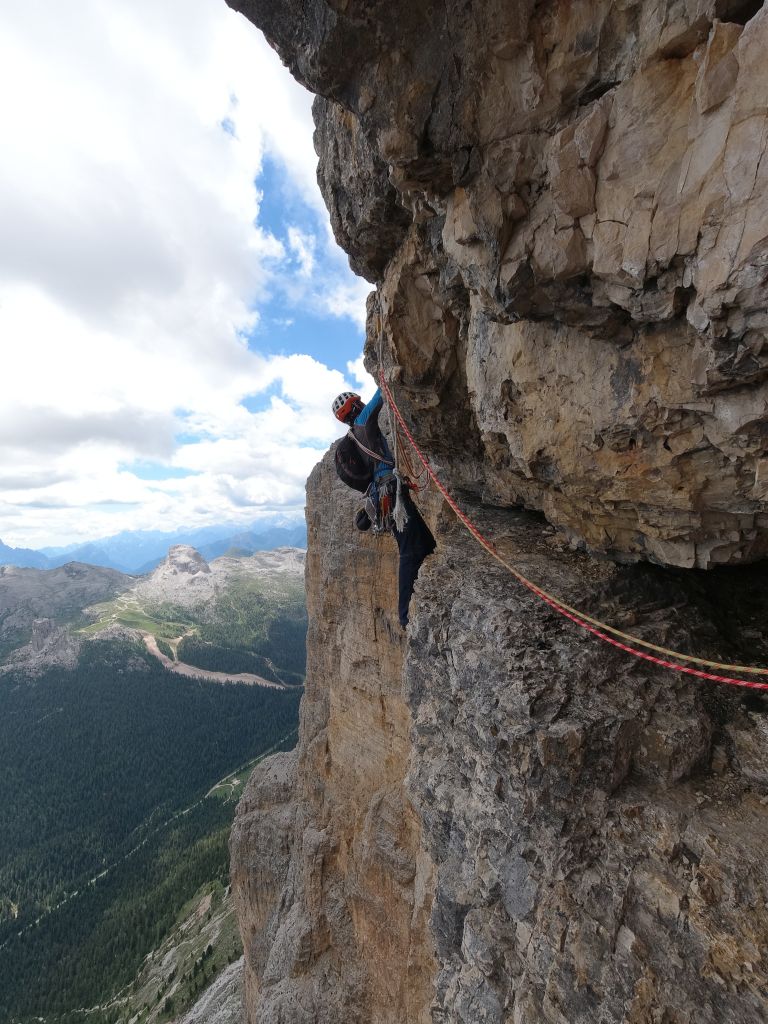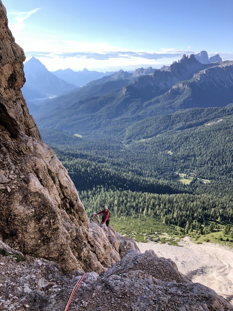 25.07.2020 - On our way west we have another break at the Tofana di Rozes. This time we get up particularly early to be the first to climb the 3. Pfeilerkante (V+, 21 pitches). Despite the early hour the day greets us with blue sky instead of fog. In the first pitches we are still a bit cold, In the first pitches we are still a bit cold, but later on the temperatures are perfect for climbing. It is a pleasant climb without particular highlights but with a great view. The easier pitches are partly brittle. The traverse is not difficult since we only have to climb past the edge. But the spot is very exposed. Finding the route is sometimes painful, especially in the upper part where we only find a few pitons. The descent over gravel and old snowfields to trail takes time.