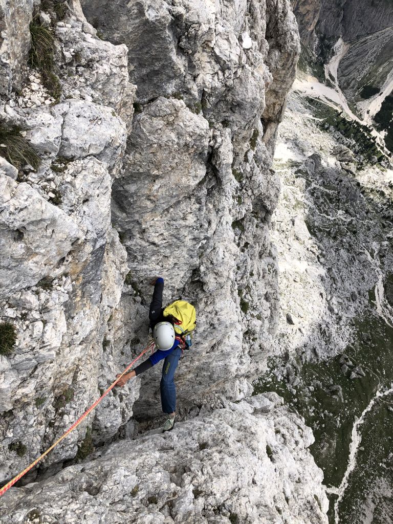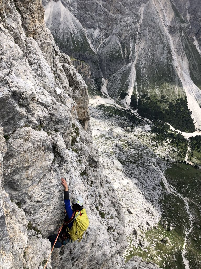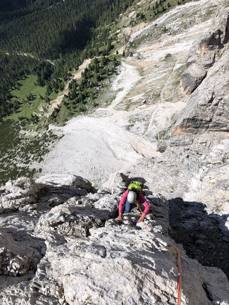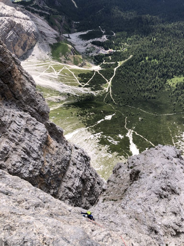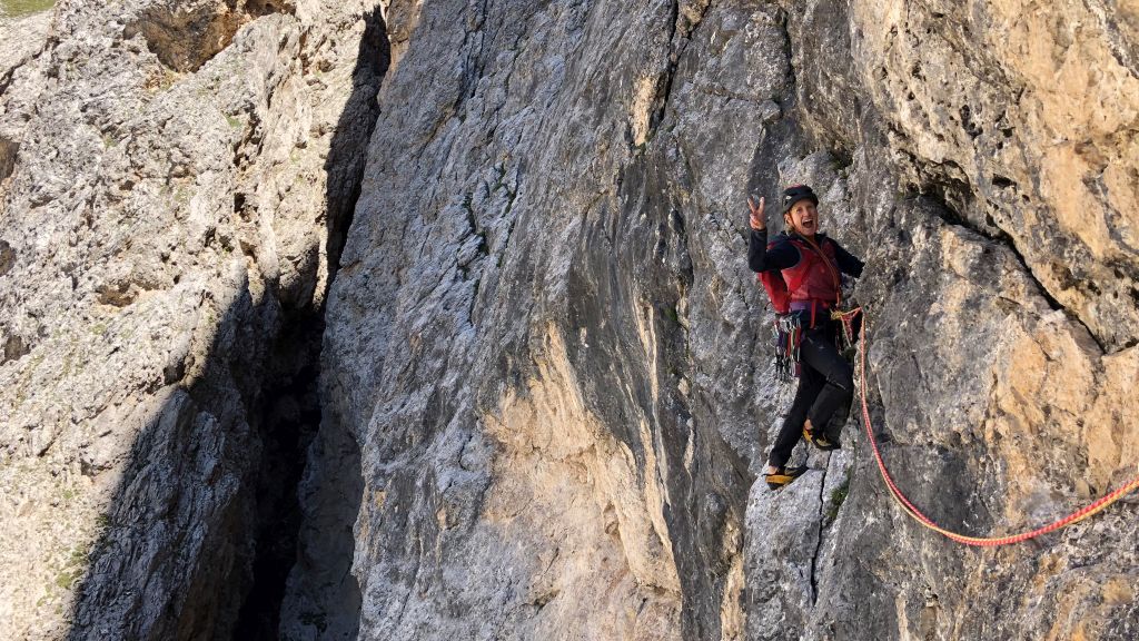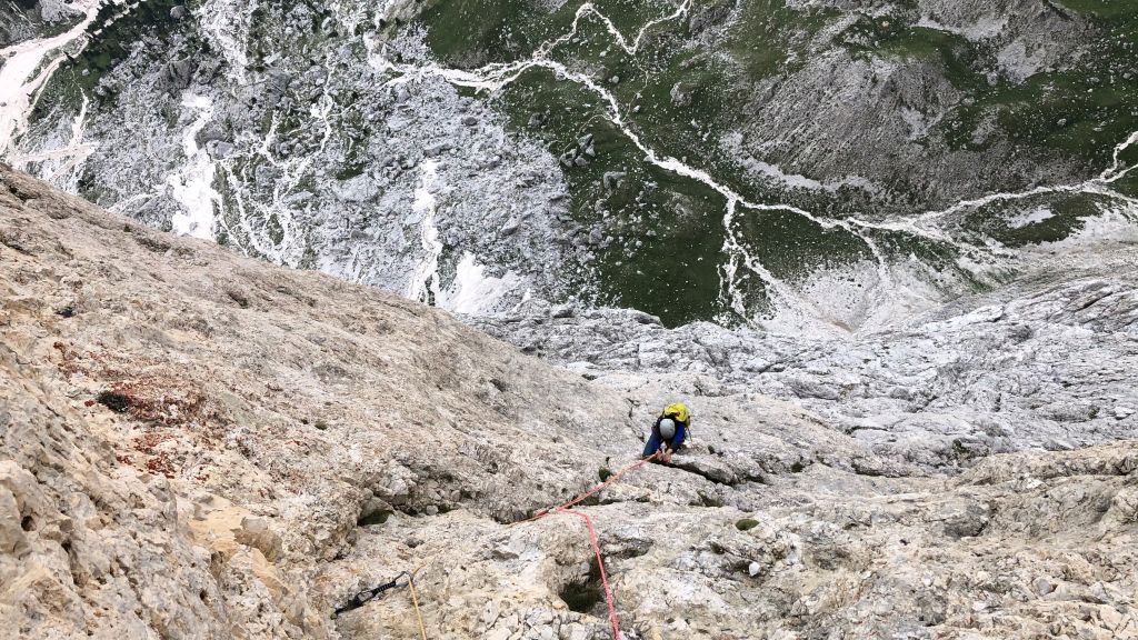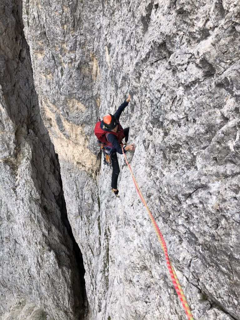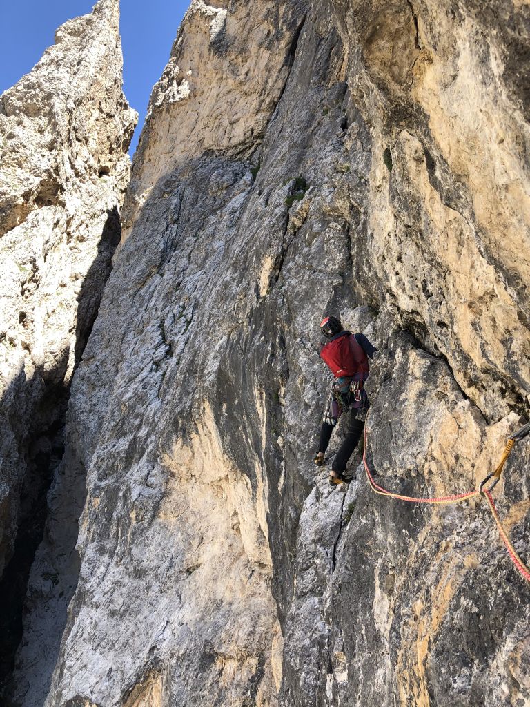 28.07.2020 - While I treat myself to an espresso at the Rifugio Gardeccia and hike down to Elmo later, Sigi sets off with Caro. She came from Munich to climb a few routes with Sigi. Their first climb is the route Via Weiss - Battisti - Colli (VI+, 11 pitches) on the Pala della Ghiaccia. Due to the perspective of the wall picture, they have troubles to find the start. But the route is worth the search. It offers steep and grippy climbing with great traverses as soon as the lower somewhat brittle section is passed.