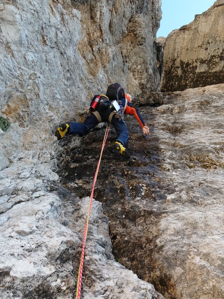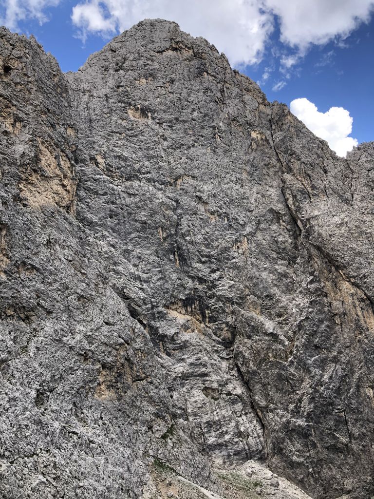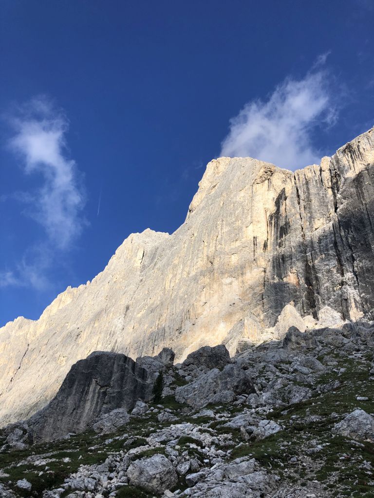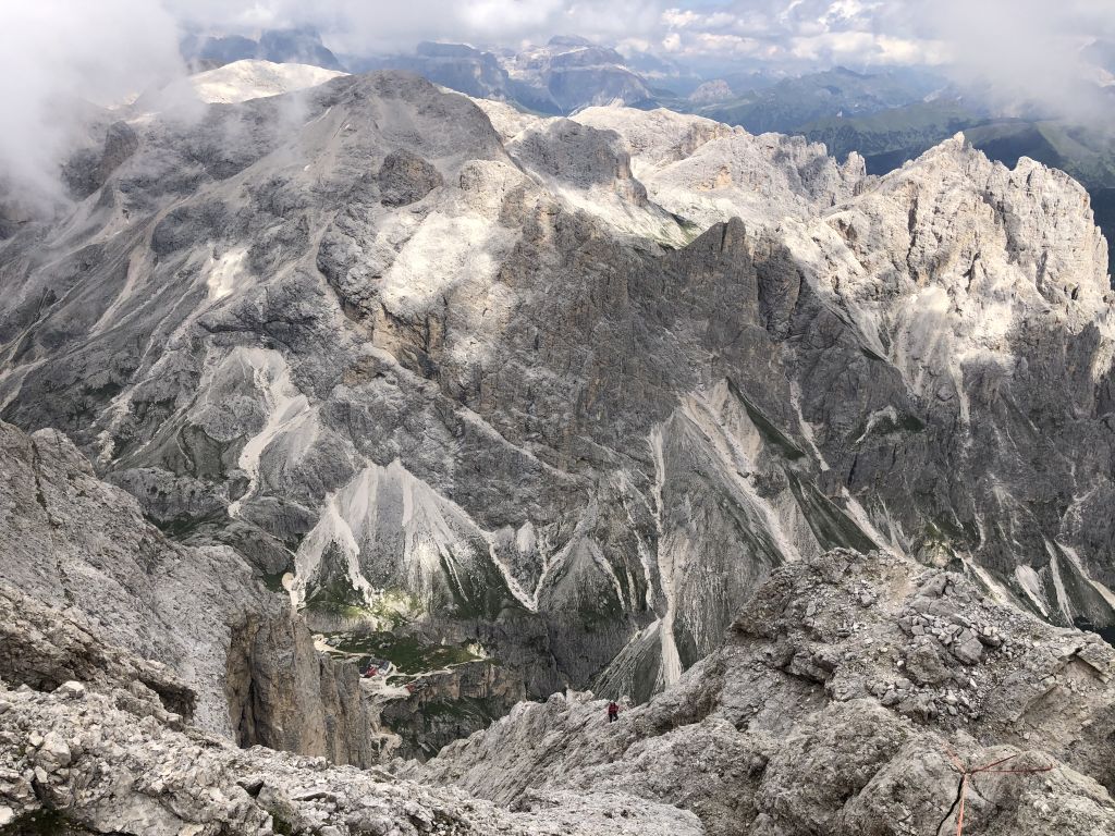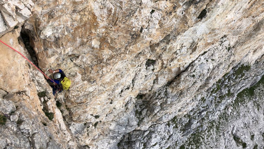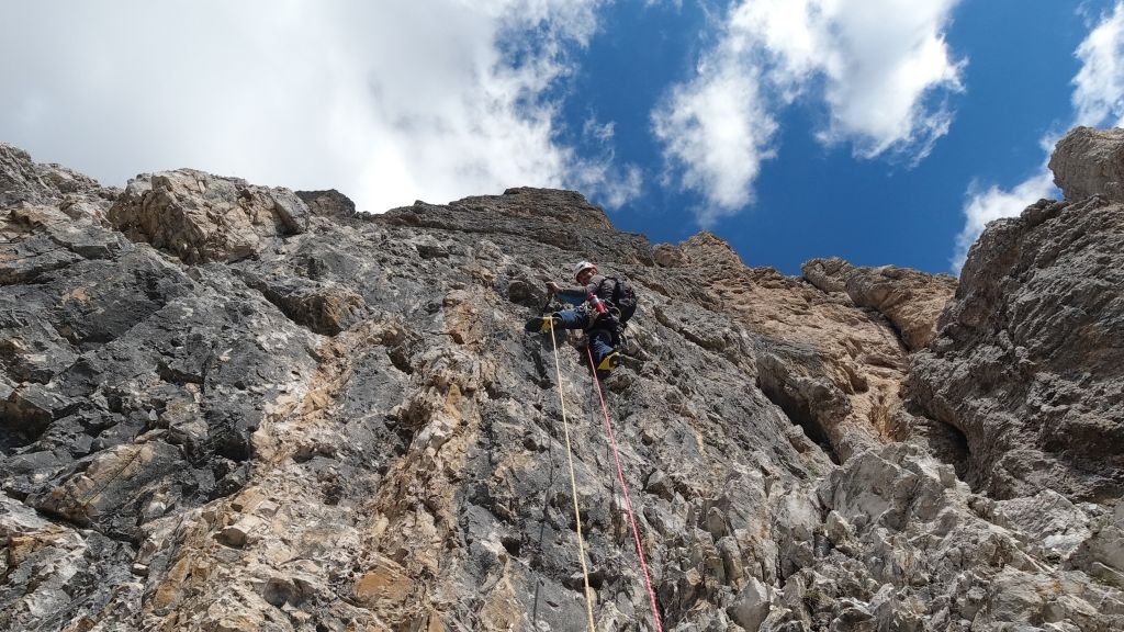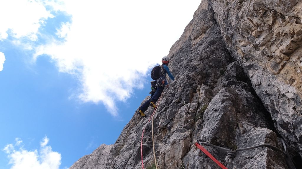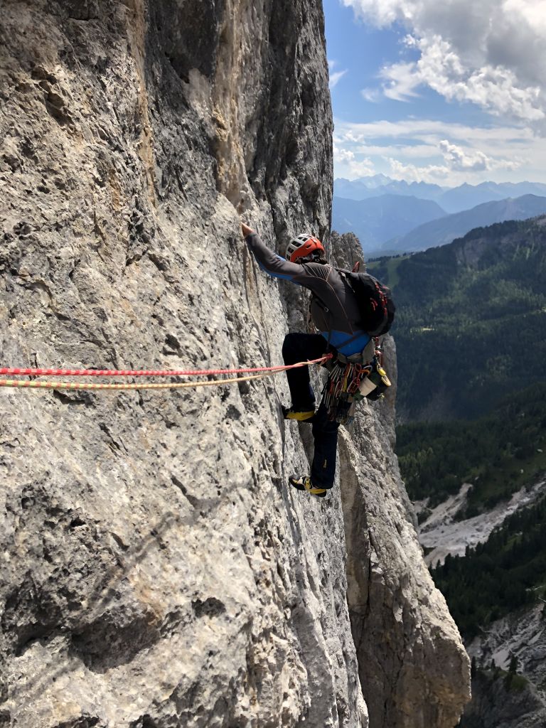 28.07.2020 - While I treat myself to an espresso at the Rifugio Gardeccia and hike down to Elmo later, Sigi sets off with Caro. She came from Munich to climb a few routes with Sigi. Their first climb is the route Via Weiss - Battisti - Colli (VI+, 11 pitches) on the Pala della Ghiaccia. Due to the perspective of the wall picture, they have troubles to find the start. But the route is worth the search. It offers steep and grippy climbing with great traverses as soon as the lower somewhat brittle section is passed.
