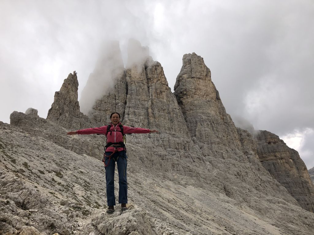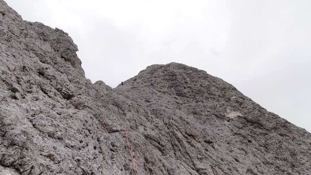 26.07.2020-27.07.2020 - Next on Sigi’s wish list is the classic route Steger (VI-, 19 pitches) on the Rosengartenspitze. Since the cable cars and the bus depart too late, we ascend the day before and set up our small alpine tent for the night enjoying the view of the route. We meet a couple from Portugal who are planning to climb the same route and even want to set off earlier than we do. They promise to let us pass in the route if we catch up with them. This allows us to sleep one hour longer. We pass them after the cruxes in the lower section of the wall which require concentration, a proper technique and a firm pull. The climb is beautiful, yet it includes an exposed but easy traverse and quite a lot of chimneys and dihedrals of different sizes. The topmost chimney requires a calm mind. It is wet and slippery which is quite exciting since there are only two or three pitons alone the 20 meter climb. The view from the summit is magnificent even though one side of the mountain is completely covered in fog. The descent requires full concentration because the normal route has to be partly climbed down and partly rappelled. Via hiking trails we return to our tent.