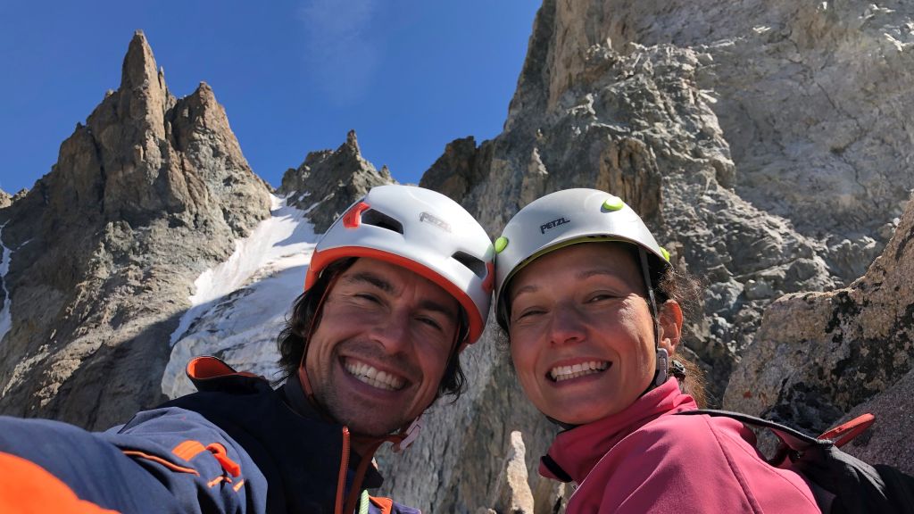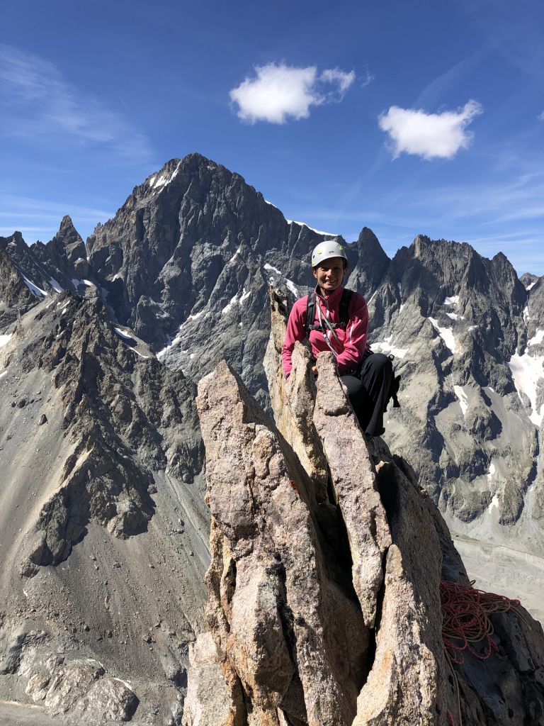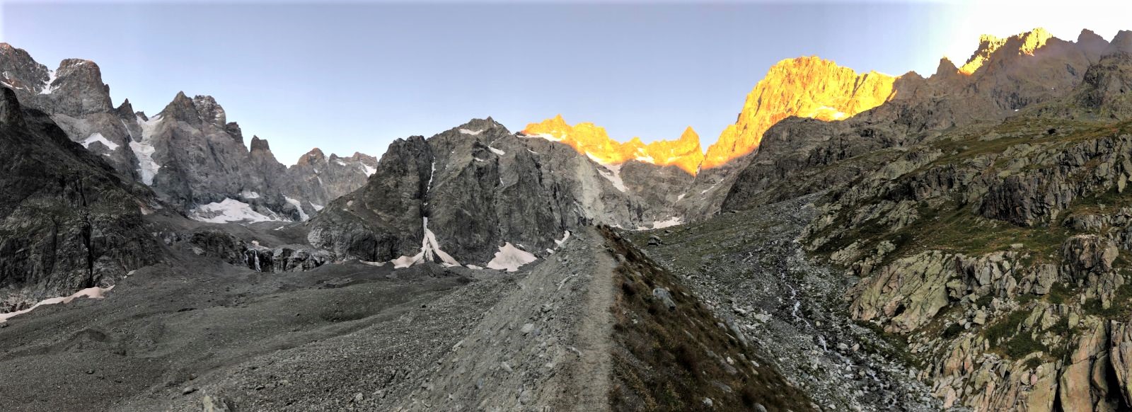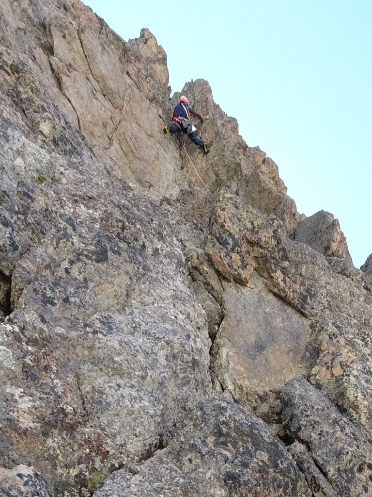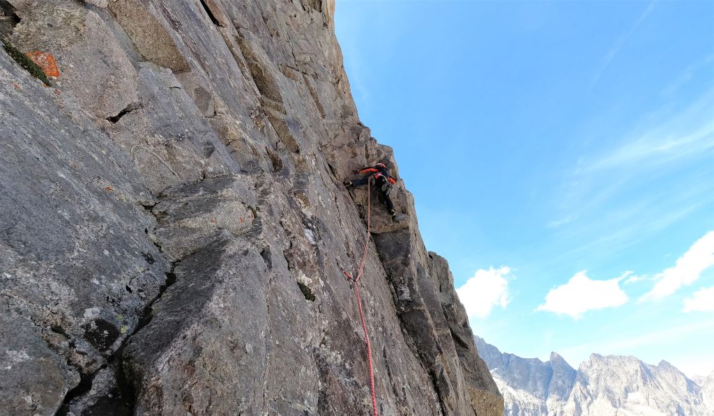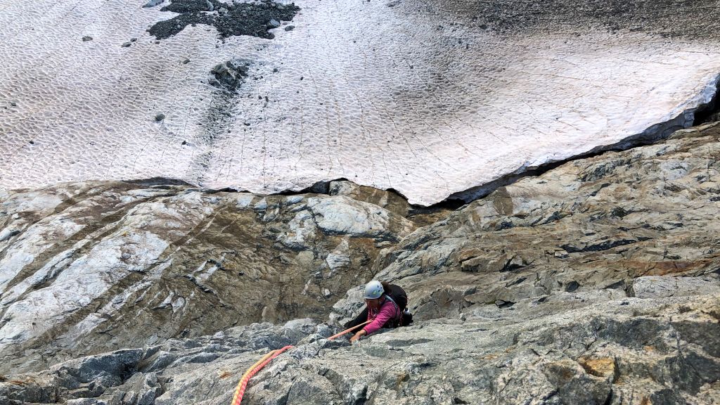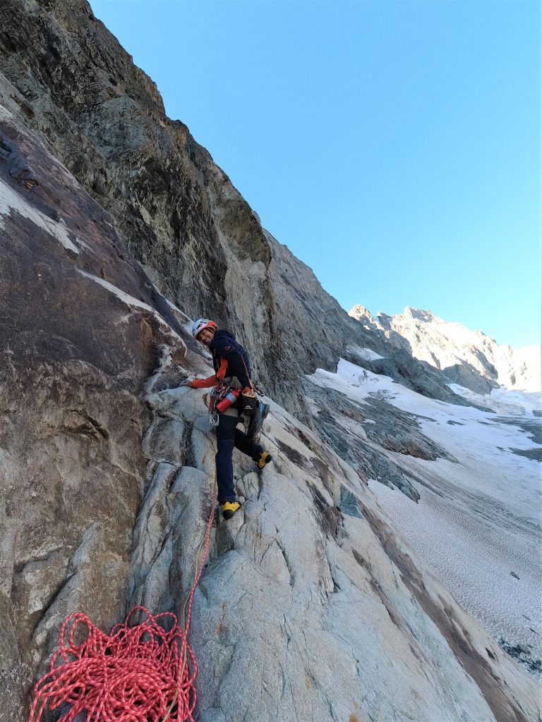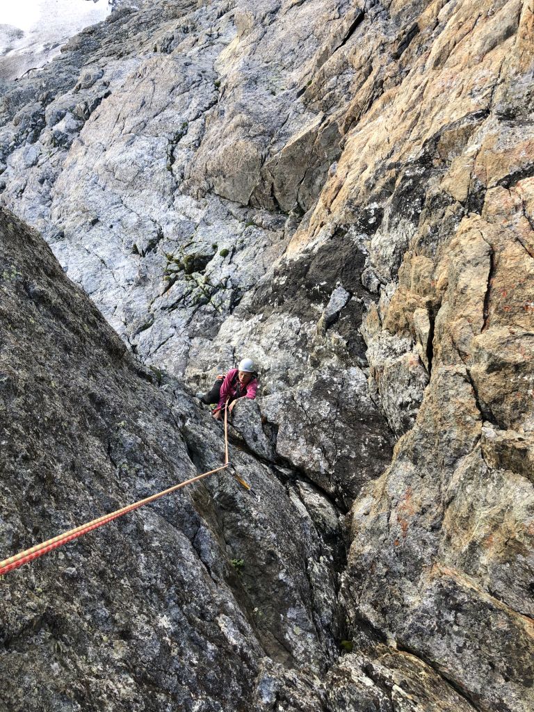 15.08.2020 - In pitch darkness we set off from the parking area. It is a pleasant walk until we have to descend the moraine and cross the Glacier Noir. The snowfield at the base of the wall is firmly frozen, but we can pass it without crampons or spikes because of the many frozen stones on this surface. Finding the exact starting point of the route Big tower is watching you (6a/A0, 22 pitches) on the Pic Sans Nom takes longer than expected. The first few pitches are brittle, but the rock gets more solid afterwards. However, there are still a lot of loose stones and the rock is covered with lichen and slightly sandy. Nevertheless, there are a few great climbing sections.