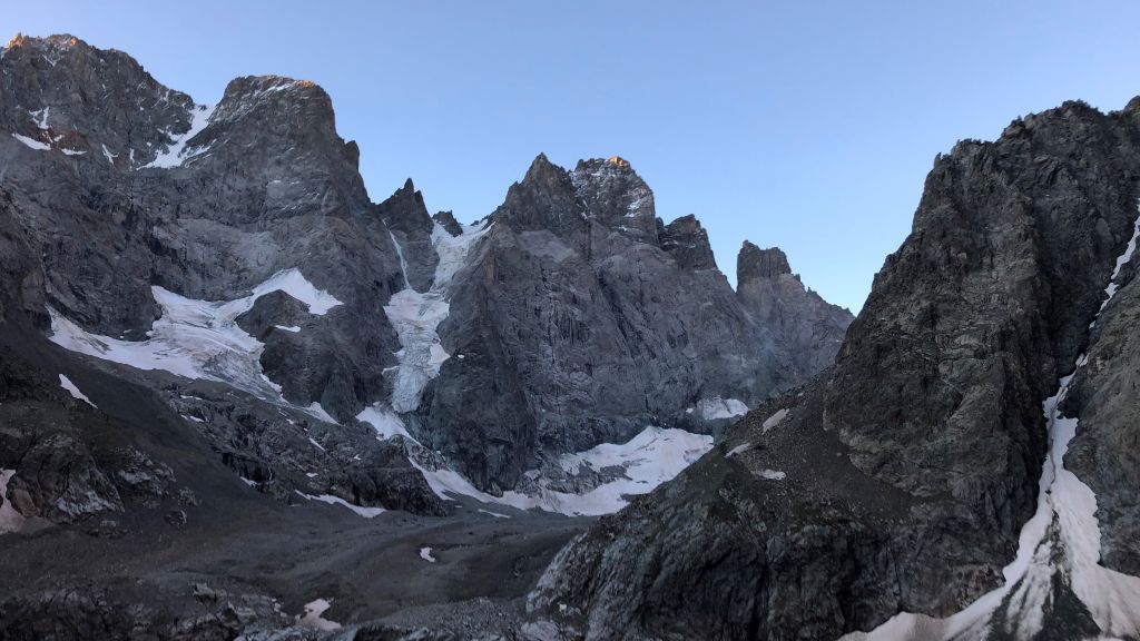 Above all, steady nerves are required for rappelling over difficult terrain which takes several hours. Even though we choose the recommended neighboring route Une Septentrion Pour Rire for rappelling, our rope gets stuck and Sigi has to get up a 6a pitch to free it. In the lower section of this route many bolts are twisted by rockfall. When we finally reach the base of the wall, the soft snowfield is easy to pass. On the way back across the Glacier Noir it gets dark. We continue using our GPS tracks. Despite the cairns, the final passage up the moraine is hard to find. Sigi scrambles up the steep terrain, which is mainly covered by loose scree, and helps me up using a rope. After that the way to the parking area feels like never-ending, but at least we find a place to refill our water bottles.