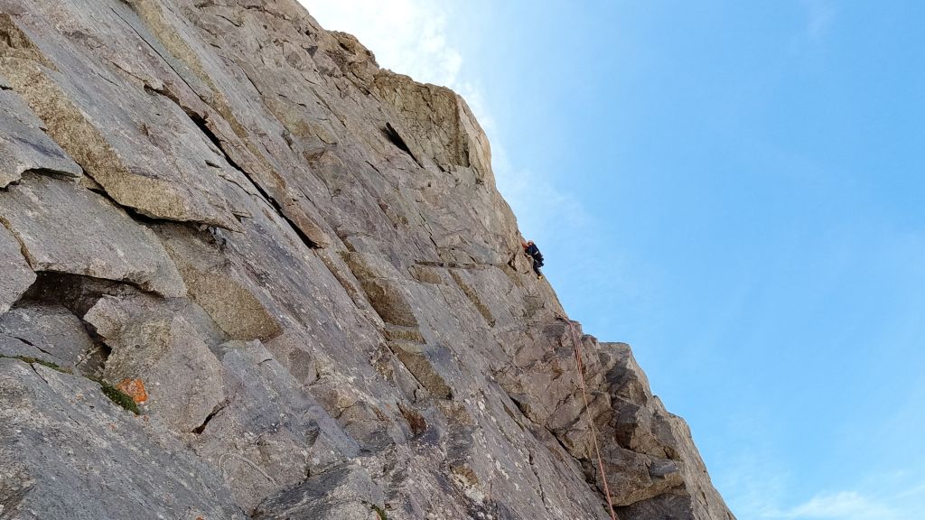 Something we do not know at this point: In 2015 there was a rockfall in the second pitch. Meanwhile a variant has been established on the left which is much more difficult, but it can be climbed A0. Sigi is quite surprised when he encounters an estimated 7a crux in a supposed 6a pitch. He can free climb the entire route, but he has to pull hard several times. Furthermore, pitch by pitch there is less protection and a few CAMs and nuts would have been helpful.